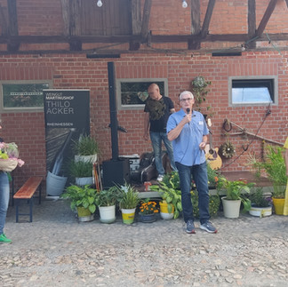 Gegen halb 6 war der Hof schon gut gefüllt und bald darauf wurden schnell aus der Nachbarschaft noch mehrere Sitzgelegenheiten organisiert und aufgestellt, damit möglichst Viele Platz fanden. Um 18.00 Uhr bedankte sich der Geschäftsführer der BTG Heideschwimmbad Höfer, Herr Christian Bell, zusammen mit seiner Frau Heike, bei dem Ehepaar Thies für die Bereitschaft, ihren Hof so viele Jahre für dieses dadurch in seiner Atmosphäre einzigartige Weinfest zur Verfügung gestellt zu haben. Er gab zum einen seinem Bedauern Ausdruck, dass es das letzte Mal sein sollte, zeigte aber auch volles Verständnis für den Wunsch der Eheleute Thies, aus Altersgründen für die Zukunft mehr Ruhe auf ihrem Hof einkehren lassen zu wollen. Anschließend überreichte er Johanna Thies ein angemessenes Präsent und verkündete, dass es natürlich in den nächsten Jahren mit dem Weinfest weitergehen würde, dann eben an anderer Stelle in Höfer. Welcher Ort es sein wird, kann man zu gegebener Zeit in den Medien der Region erfahren. Schließlich stellte er den in Höfer schon bekannten Musiker dieses Abends, Ollie Spiess vor. Dieser hatte schon vor etwa 15 Jahren hier für musikalische Untermalung gesorgt. Auch am heutigen Abend war er gut in Form und brachte mit kontrastreicher und breit gefächerter Auswahl seiner Stücke zu vorgerückter Stunde so einige Besucher zum Tanzen. In seinen Spielpausen war ausreichend Zeit für Klönschnack und diversen Gläsern Wein. Eine dieser Pausen nutzte Fritze Trumann dazu, wieder mit seinem Hut herumzugehen, um für die Musik zu sammeln. Am Ende war sein Hut mehr, als gut gefüllt.